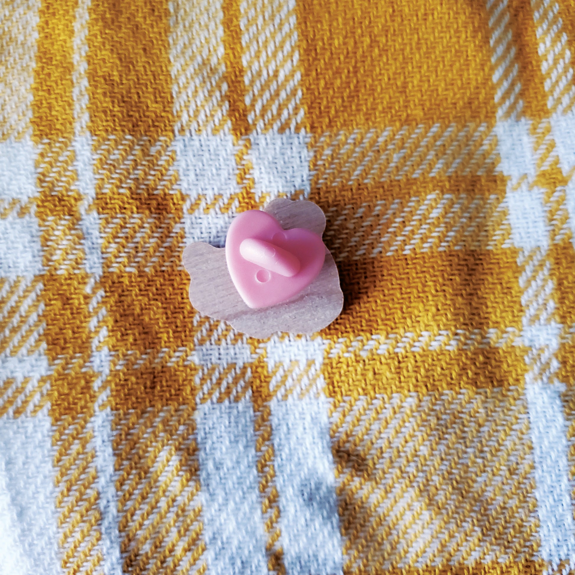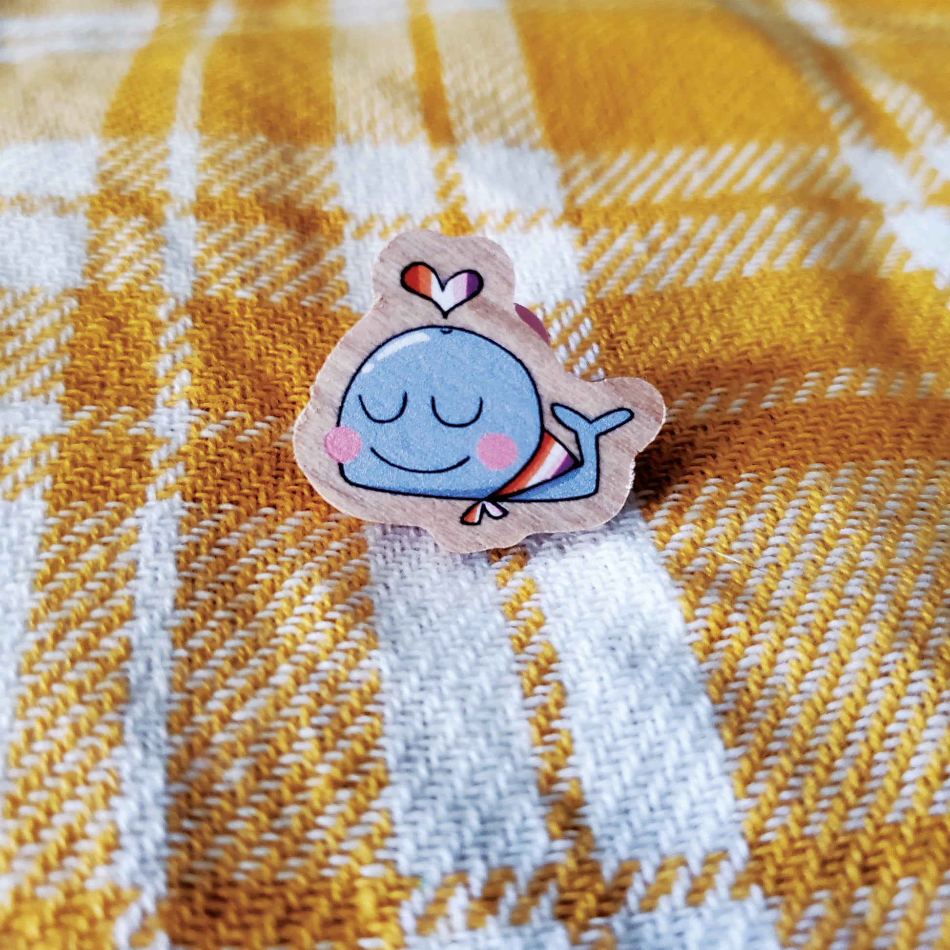 1 inch pride whale red cherry wooden pin with pink heart shaped rubber backing.